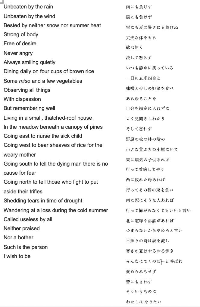 これは、日本の有名な作家、宮沢賢治(みやざわけんじ)が書いたもので、彼が亡くなったあと、1冊のノートの中から見つかったそうです。もともとは詩として書かれたものではなく、自分に向けたメモのようなものでしたが、今では多くの人に詩として読まれ、宮沢賢治の代表作のひとつとされています。